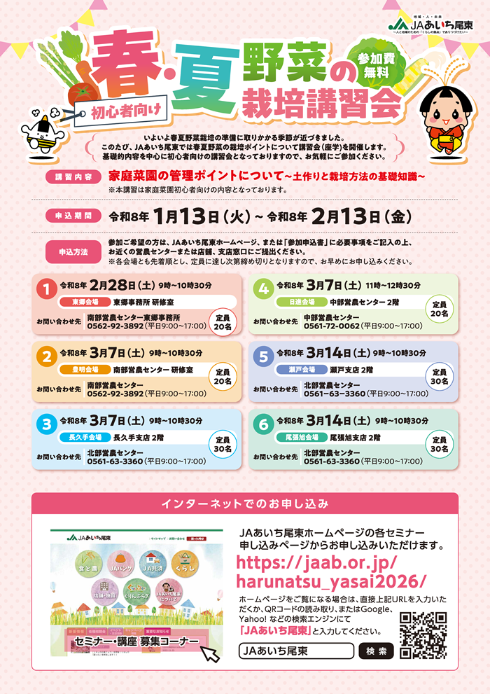 いよいよ春夏野菜栽培の準備に取りかかる季節が近づきました。このたび、JAあいち尾東では、春夏野菜の栽培のポイントについての講習会(座学)を開催します。基礎的内容を中心に初心者向けの講習会となっておりますので、お気軽にご参加ください。 ※参加費無料