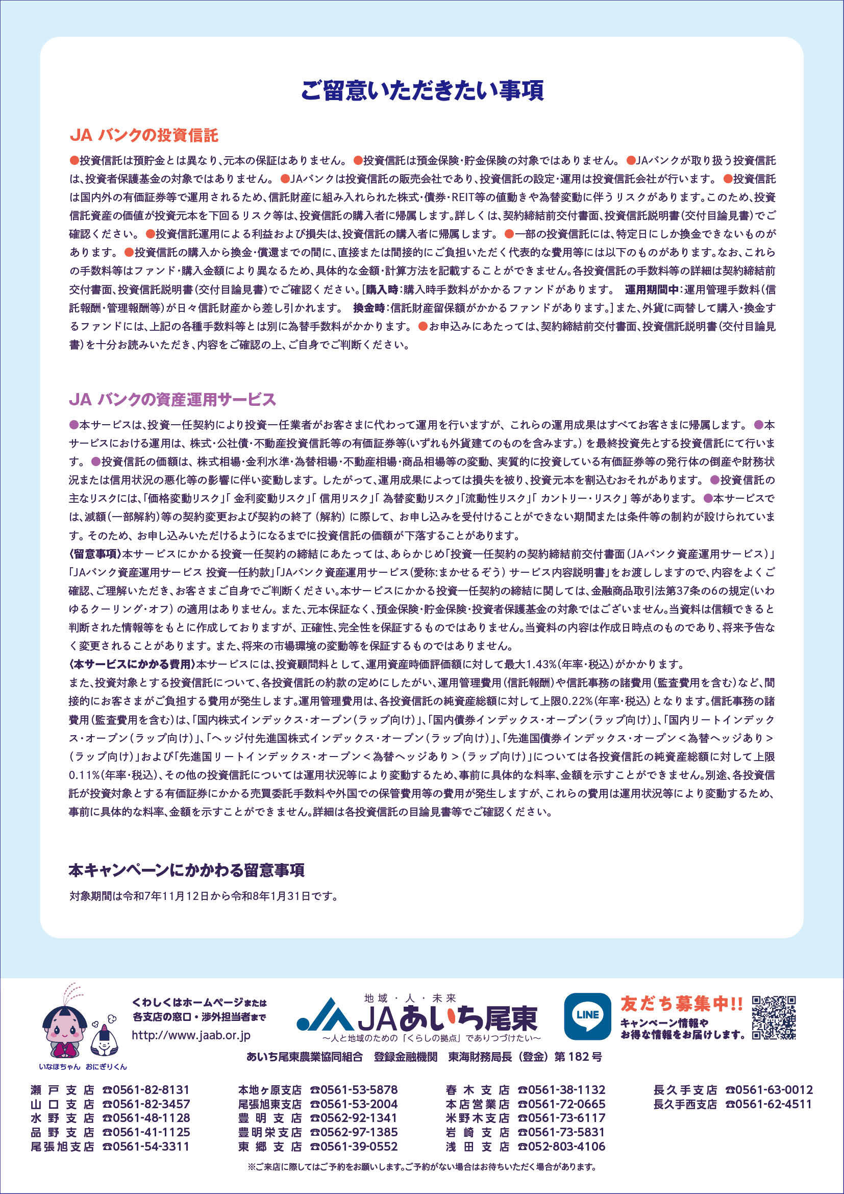 令和7年11月12日(水)から令和8年1月30日(金)の期間中に、びとうまれ定期貯金をご契約いただいた方の中から抽選で400名様に、JAあいち尾東管内等のグリーンセンターでご利用いただける、ふれあい商品券5千円分をプレゼントします。