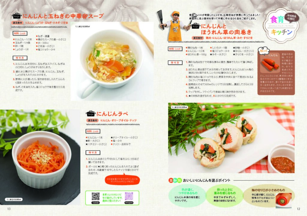 【ぐりんぷらざ2月号】にんじんとほうれん草の肉巻き、にんじんと玉ねぎの中華卵スープ、にんじんラペ