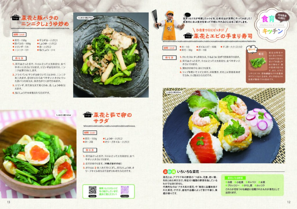 【ぐりんぷらざ3月号】菜花とエビの手まり寿司、菜花と豚バラのニンニクしょうゆ炒め、菜花と茹で卵のサラダ